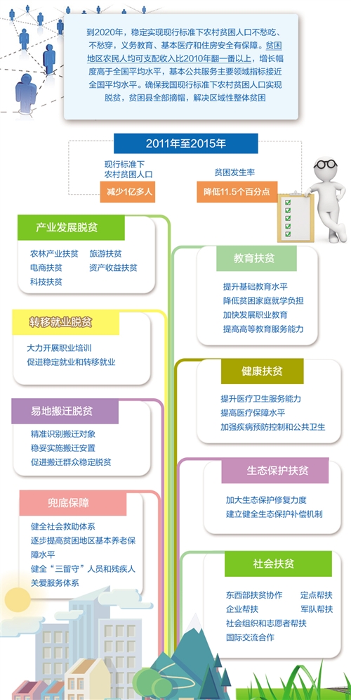 国家发改委地区司有关负责人介绍,《规划》按照精准扶贫精准脱贫基本方略要求,因地制宜,分类施策,从8个方面实化细化了相关路径和措施:一是产业发展脱贫,主要包括农林产业扶贫、旅游扶贫、电商扶贫、科技扶贫等方面,提出了13项产业扶贫工程或具体措施;二是转移就业脱贫,主要从组织开展职业培训和促进转移就业等方面,提出了6项就业扶贫行动;三是易地搬迁脱贫,对“一方水土养不起一方人”地区建档立卡贫困人口实施易地扶贫搬迁,实现搬得出、稳得住、能脱贫;四是教育扶贫,主要从基础教育、职业教育和降低贫困家庭就学负担等方面,提出了一系列行动计划和措施,不断提升贫困人口综合素质和就业技能,逐步消除因学致贫问题,阻断贫困代际传递;五是健康扶贫,主要从医疗卫生服务、医疗保障、疾病防控和公共卫生等方面,提出了6大健康扶贫工程,加快推进基本公共卫生服务均等化,有效缓解因病致贫返贫问题;六是生态保护扶贫,主要从生态保护修复、生态保护补偿机制2个方面,提出了11项重大生态扶贫工程和4项生态保护补偿方式,使贫困群众通过参与生态保护实现脱贫;七是兜底保障,主要从社会救助、基本养老保障、农村“三留守”人员和残疾人等方面,提出了社会保障兜底措施,通过筑牢社会保障安全网,解决好特殊困难群体和弱势群体的脱贫问题;八是社会扶贫,主要从东西部扶贫协作、定点帮扶、企业帮扶、军队帮扶、社会组织和志愿者帮扶,以及国际交流合作等方面,提出了相关措施和要求。