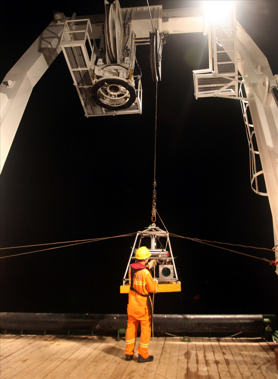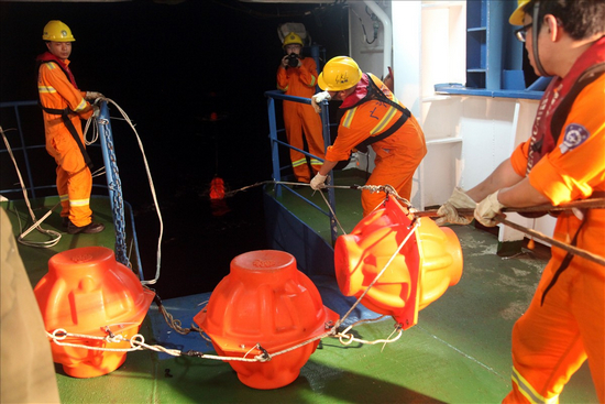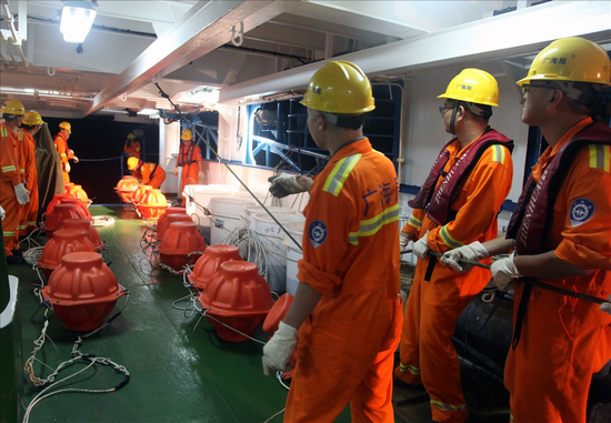 几名科考队员一只接一只将浮球顺着后甲板的弧形滑道投入海中,另有三名科考队员紧紧抓住拴在浮球链末端的一根缆绳。夜幕深深,橘黄色的浮球飘荡在海面上,像是在暗蓝色的大海上点起了一盏盏小桔灯。