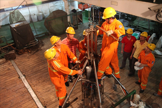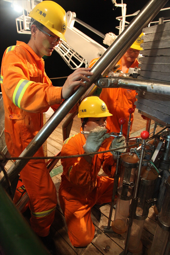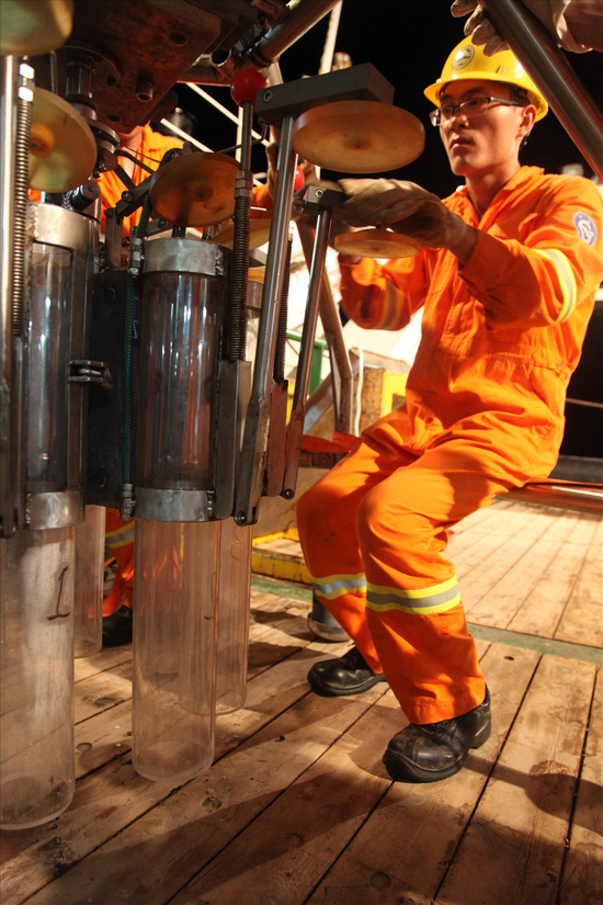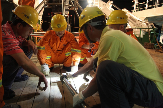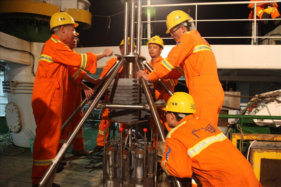约莫1个小时后,多管取样设备调试完毕。万事俱备,只待到点作业。当地时间10月12日凌晨2:00左右,多管设备开始布放。首席们、技术骨干们熬夜等着取样结果。