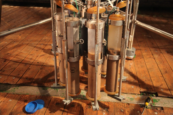 下午17:00,首席科学家生产助理盛堰召集调查部的技术骨干一起,会诊多管取样,从作业区底质分析、多管设备本身以及收放作业方式等方面做了详细梳理。晚上19:00,技术骨干们再次来到了后甲板,利用作业的间隙,现场对多管取样器进行现场调试。这次加大了手术力度,拆开了活塞杆,去掉了可能阻碍插入的胶皮,增加配重,对逐根取样管调整了释放弹簧的松紧,大家一边讨论一边拿出工具进行调试,确保能够取得足够长度的样品。