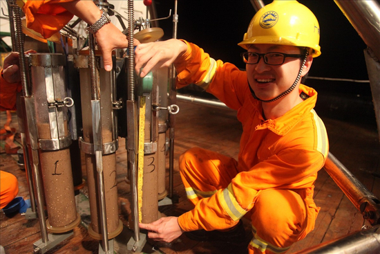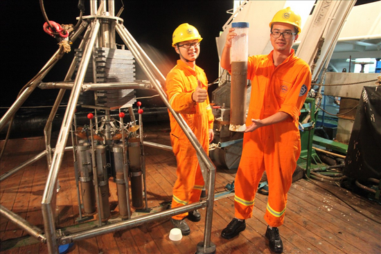 当地时间凌晨4:00左右,多管取样平台出水,众人舒了一口气——8管取样筒里几乎全是沉积物。看这管里满满都是“泥”,大家脸上满满都是笑啊!