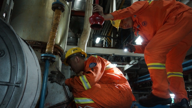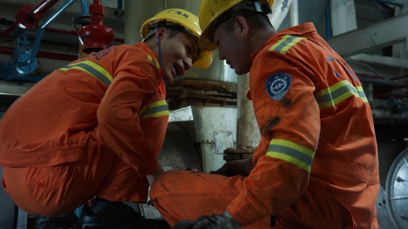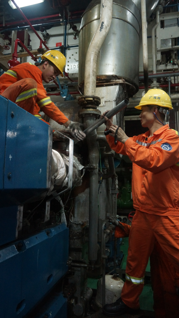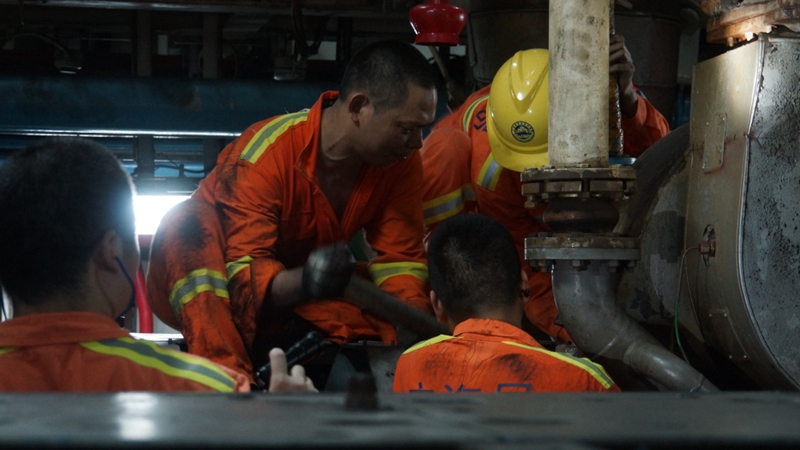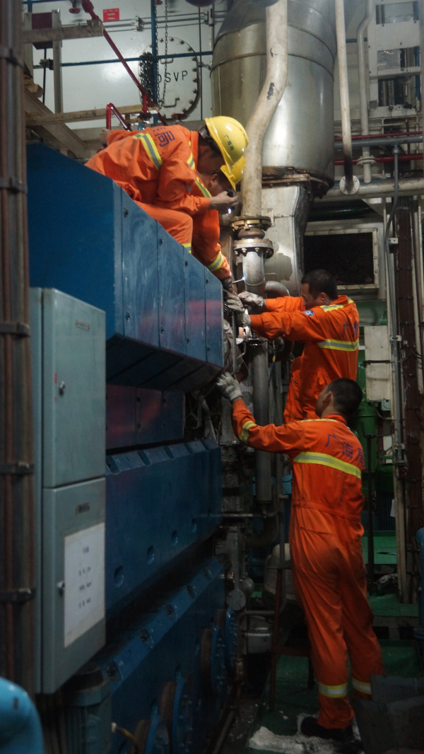 8月12日,行驶在太平洋上的海洋六号正在工区作业。突然,1号发电柴油机组排烟管冒出浓烟,炙热的烟气穿透了上面包裹着的厚厚隔热层,机舱温度骤然升高。1号发电柴油机组是3组驱动整个船舶前进的重要动力设备之一,必须立即停机检修处理。船在行进,机舱里,另外2台发电柴油机组发出巨大的轰鸣声。轮机部的技工们在高温、高噪音的环境中连续工作两个多小时,终于找到了问题症结,排除了故障。
