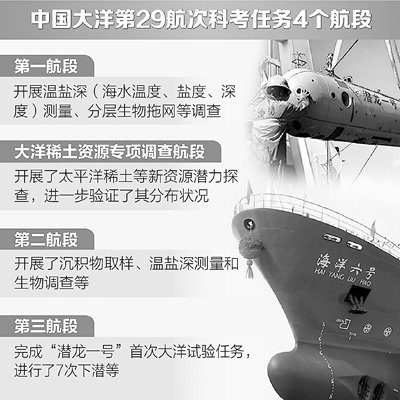 第二、三航段首席科学家、广州海洋地质调查局教授级高级工程师刘方兰介绍说,中国大洋第29航次科考分为三个航段,此外在第一、二航段之间增设中国地调局大洋稀土资源专项调查航段。在不同的航段,“海洋六号”分别完成了采薇海山矿区资源与局部区域详细勘探,CC区多金属结核详细勘探、新资源调查及对6000米无人无缆潜器“潜龙一号”应用性试验。与此同时,同步在各调查区开展环境、生物调查,特别是在CC区进行了大范围多手段的综合环境调查。此外,在中国地调局航段开展了深海稀土新资源的探查工作。科考队员采用多种手段,系统开展了太平洋稀土等新资源潜力探查,进一步验证了其分布状况。
