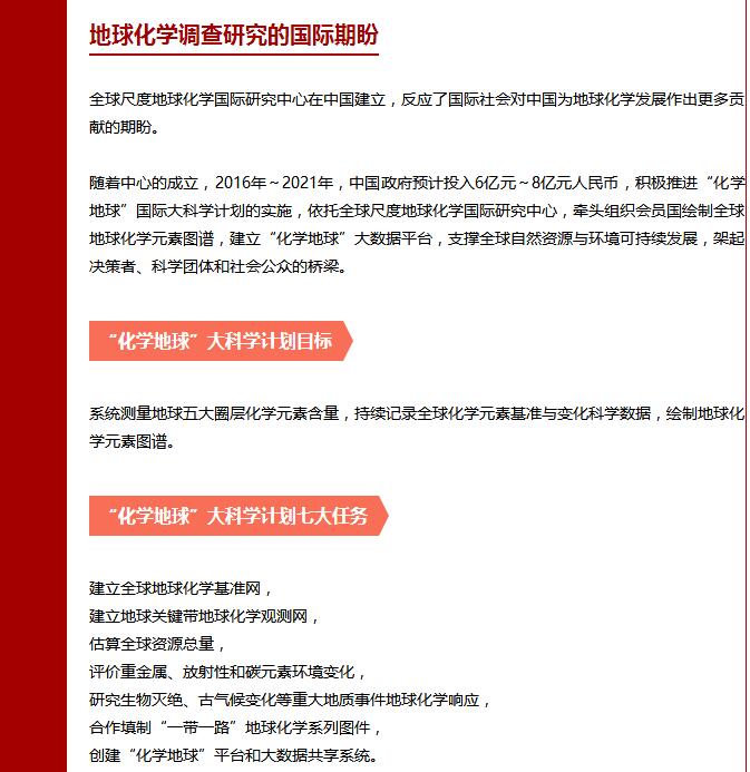 该中心依托中国地质调查局中国地质科学院地球物理地球化学勘查研究所建立,将致力于提升全球地球化学调查研究水平,推进“化学地球”国际大科学计划实施,编制全球地球化学一张图,建立数字地球的“化学地球”平台,为全球资源可持续利用和全球环境变化研究提供基础数据,为促进地球科学进步、人与地球和谐发展贡献中国力量。