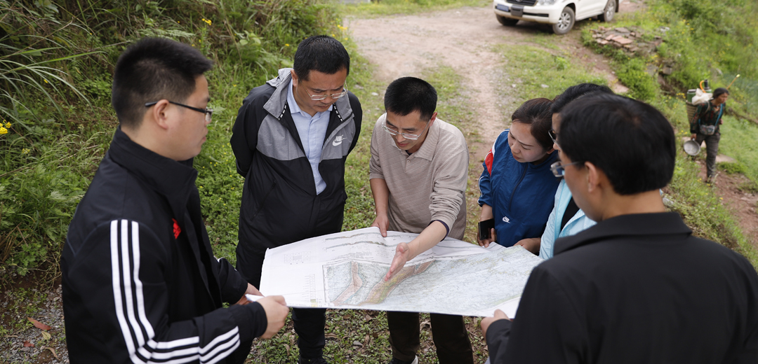 中国地质调查局成都地质调查中心四川广安资源环境综合地质调查项目负责人李明辉(左三)与广安市邻水县县委书记赵璞(左二)、广安市邻水县高滩镇党委书记钟超(左四),在邻水县高滩镇倒碑村现场交流2020年度广安市华蓥山东翼地热试验井孔位选址相关事宜。