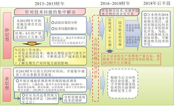 日本于2000年6月成立了甲烷水合物开发研究委员会,开始研讨开发计划,以实现甲烷水合物更为经济的钻探和生产采收目标,2001年7月,发布了《日本甲烷水合物开发计划》。该计划分为三个阶段:第一阶段(2001~2008财年)——推进基础研究(勘探技术等),选择资源区域作为近海试采的对象,通过陆上试采的实施进行技术验证等;第二阶段(2009~2015财年)——推进基础研究(生产技术等),在日本近海区域实施海上试采等;第三阶段(2016~2018财年)——开发相关技术实现商业化开采,开展经济和环境影响评价等。