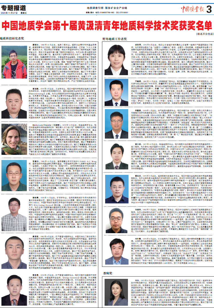 中国地质学会第十届黄汲清青年地质科学技术奖揭晓
