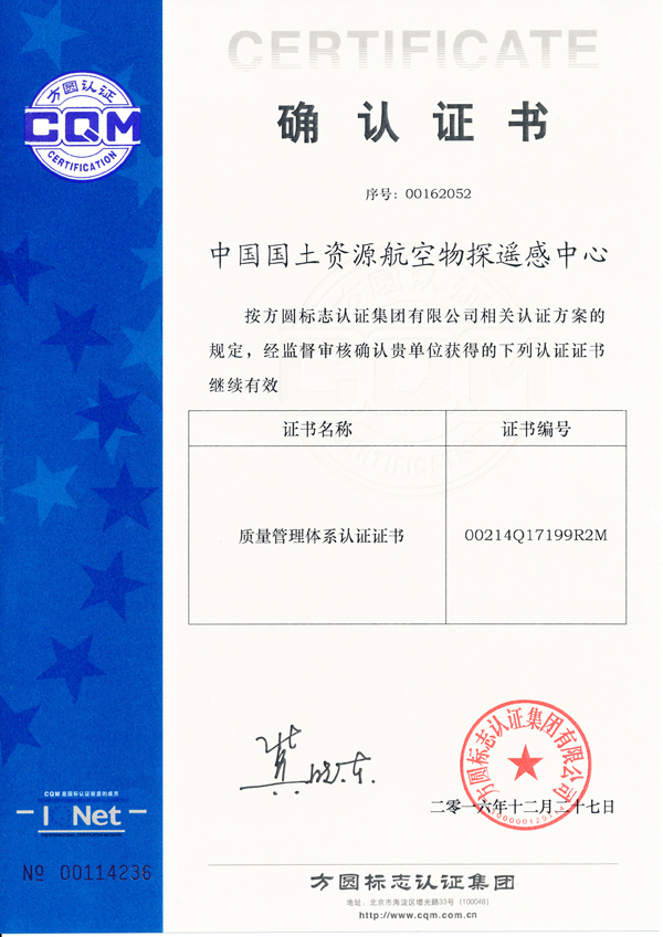 方圆认证集团近日确认地调局航空物探遥感中心的质量管理体系符合GB/T 19001-2008/ISO 9001:2008标准要求,颁发了质量体系运行有效确认证书(质量管理体系认证证书编号 00214 Q17199R2M)。