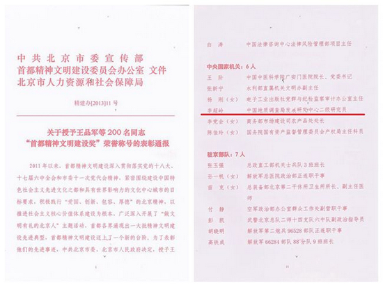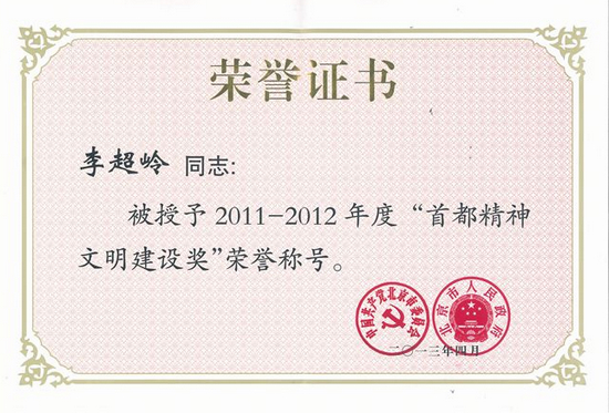 近日,发展研究中心收到中共北京市委、北京市人民政府下发的关于首都精神文明建设奖的表彰决定,我中心李超岭同志受到表彰,荣获2011-2012年度“首都精神文明建设奖”荣誉称号。