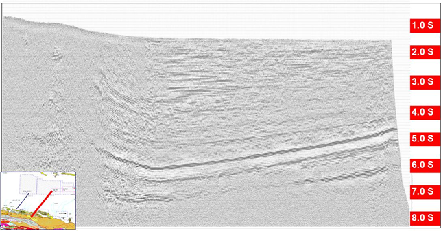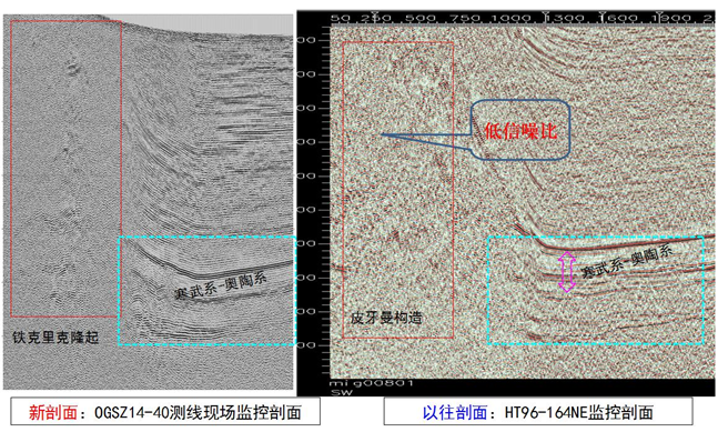 该项目于7月25日通过施工设计评审,9月12日-14日完成生产前点试验,9月21日-10月23日完成野外地震资料采集。本次采集在山前复杂构造带运用了宽线大组合的采集方式(25千米),根据现场监控剖面来看,新采集的剖面浅、中、深目的层反射齐全,同相轴连续性好,波组特征明显,构造形态清晰,信噪比较高,与以往测线对接段剖面形态一致。通过新老剖面对比发现,本次地震采集盆山接触关系较清楚,盆地内寒武-奥陶系内幕反射丰富,反射层位齐全,反射信息丰富,波组特征清楚,地质现象较明显,中深层反射信息丰富,总体来看,地震资料品质好。目前正在进行进一步处理和解释工作。