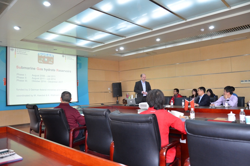 座谈期间,作为德国水合物研究计划—“SUGAR计划”的牵头人,Matthias Haeckel博士介绍了该计划已经取得的成果和正在执行的第三阶段研究情况,并详细报告了在黑海开展的天然气水合物研究进展;团队成员Christian Deusner博士则以含水合物沉积物力学性质为题,详细介绍了基于实验模拟和数值模拟方法开展的水合物储层稳定性、水合物分解过程出砂规律等研究工作。