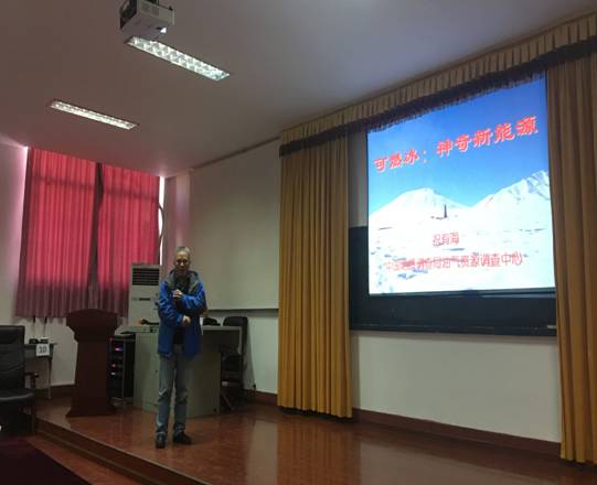 陆域天然气水合物工程首席专家祝有海研究员通过多媒体和视频方式,用形象生动与通俗易懂的语言,向学生们详细讲解了人类能源利用简史、油气形成理论、可燃冰是什么、为什么研究可燃冰以及可燃冰的开采方法、环境效应、未来前景等。讲座中,同学们积极踊跃发言与互动,对“可燃冰”这一神奇新能源拥有了浓厚的兴趣与憧憬,开阔了同学们的视野,丰富了地球科学知识,同时点燃了学生向往科学热爱科学的信念。
