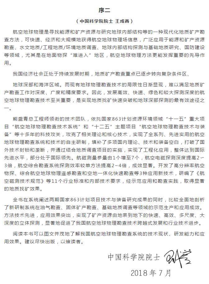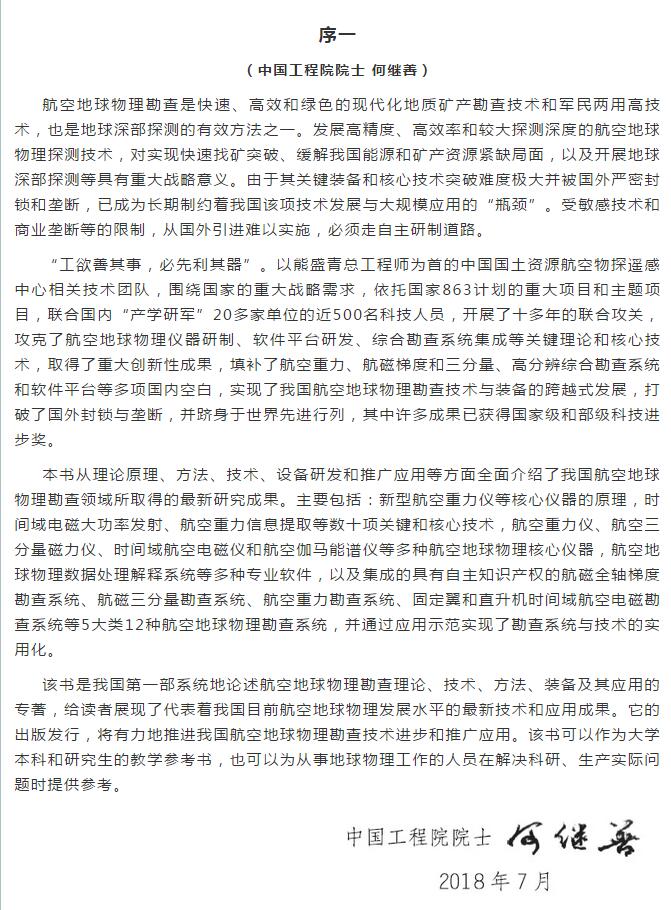 中国工程院何继善院士和中国科学院王成善院士分别为本书作序,并给予了高度评价。何继善院士认为该专著“代表着我国目前航空地球物理发展水平的最新技术和应用成果。它的出版发行,将有力地推进我国航空地球物理勘查技术进步和推广应用。”王成善院士认为:技术团队“攻克了相关理论和核心技术,实现了全系列、先进适用的航空地球物理勘查系统和技术的自主研制,填补了多项国内理论、技术和装备空白,打破了国外技术封锁和垄断,并通过结合地质调查项目的实施,实现了工程化应用,整体达到国际先进水平,部分处于国际领先”,专著论述的“方法技术先进,应用效果突出,实现了矿产资源由地表到地下的快速、高效、多尺度、大深度的立体探测,显著地促进了我国航空地球物理勘查技术跨越式发展和行业技术进步”。