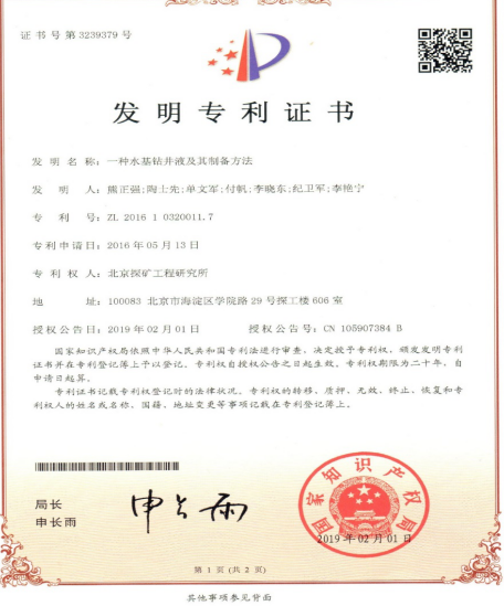 近日,自然资源部中国地质调查局北京探矿工程研究所钻井化学研发中心申报的“一种水基钻井液及其制备方法”获得国家发明专利(专利号ZL201610320011.7),为深部热能绿色勘查再添利器。