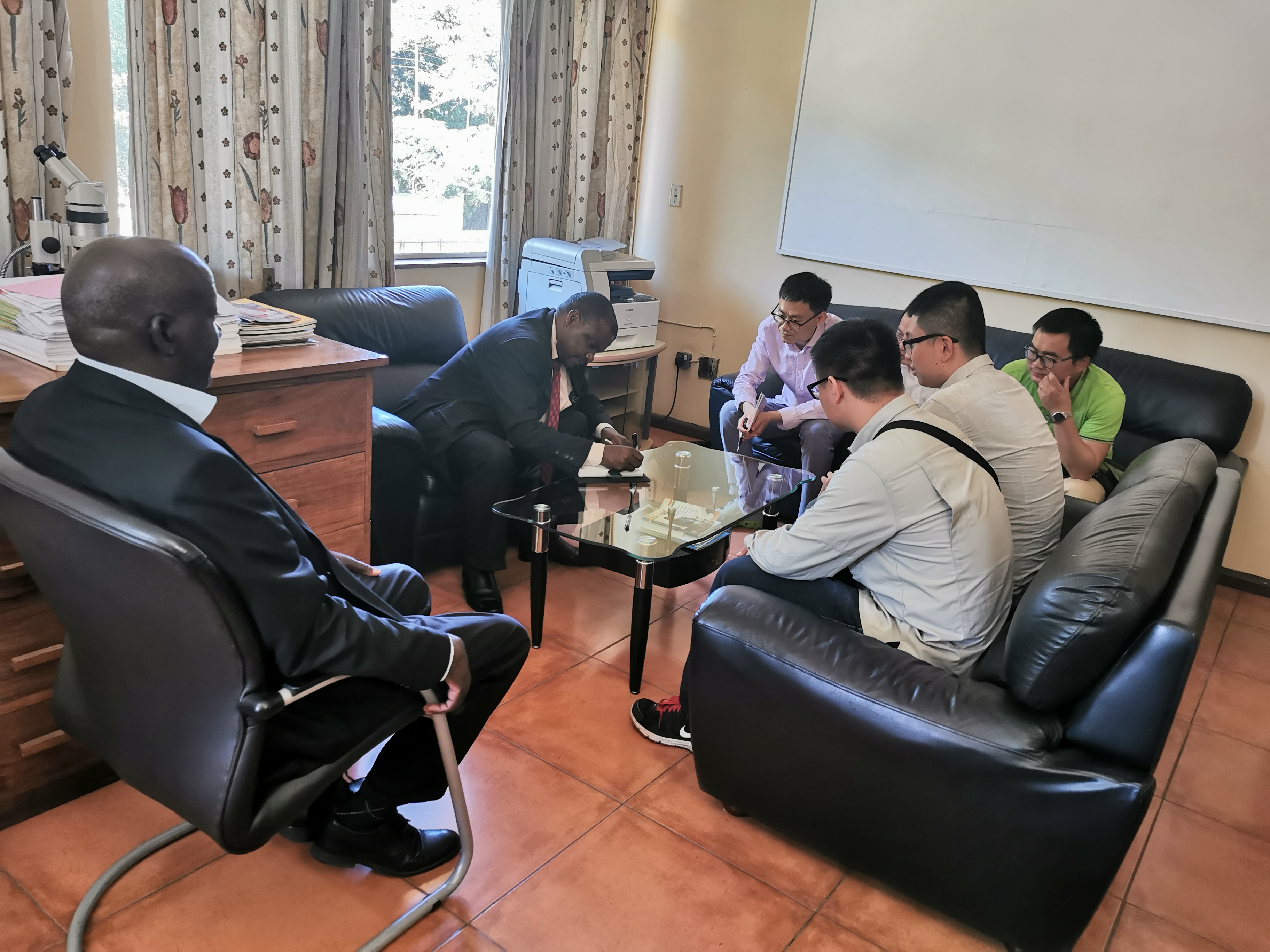 赞比亚地质调查局局长Chipilauka Mukofu及总工A.P. Dokowe等对天津地调中心一行的来访表示了热烈欢迎。双方就项目总体情况及2019年度野外工作时间、工作区域、项目组双方参与人员等事宜进行充分沟通和协商,拟定了初步的工作计划。赞比亚地调局表示将积极配合项目组在赞比亚境内的工作并给予全方面的协助。
