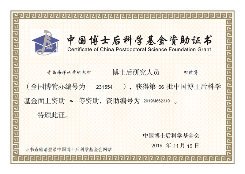 日前,中国博士后科学基金会正式发布《关于公布中国博士后科学基金第66批面上资助获资助人员名单的通知》,自然资源部中国地质调查局青岛海洋地质研究所博士后科研工作站田陟贤博士后喜获二等资助,资助额度为8万元。
