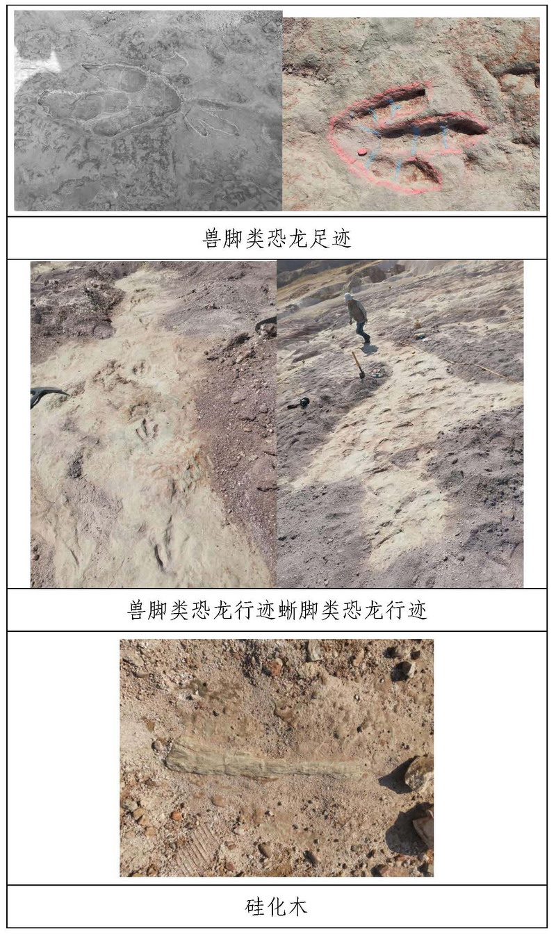 据了解,该处化石产地保存了较好的古生物学特征,出露范围约2万平方米,地表可见恐龙足迹约300余枚,其中兽脚类足迹100余枚,可见8列行迹;蜥脚类足迹约200枚,可识别4列行迹,此外还有部分无规律点,足迹保存清晰完整。根据裸露区足迹密度和赋存层位发育范围估算,预计该处清理后恐龙足迹可达上千枚,为目前发现的河北省规模最大的恐龙足迹群产地。此外,足迹群附近还发现少量恐龙骨骼化石,另有大量木化石密布于足迹化石赋存层位,木化石均已不同程度硅化,部分木化石个体大,硅化程度高、保存完整,内部结构清晰,具有极佳的科研、观赏、收藏及经济价值。
