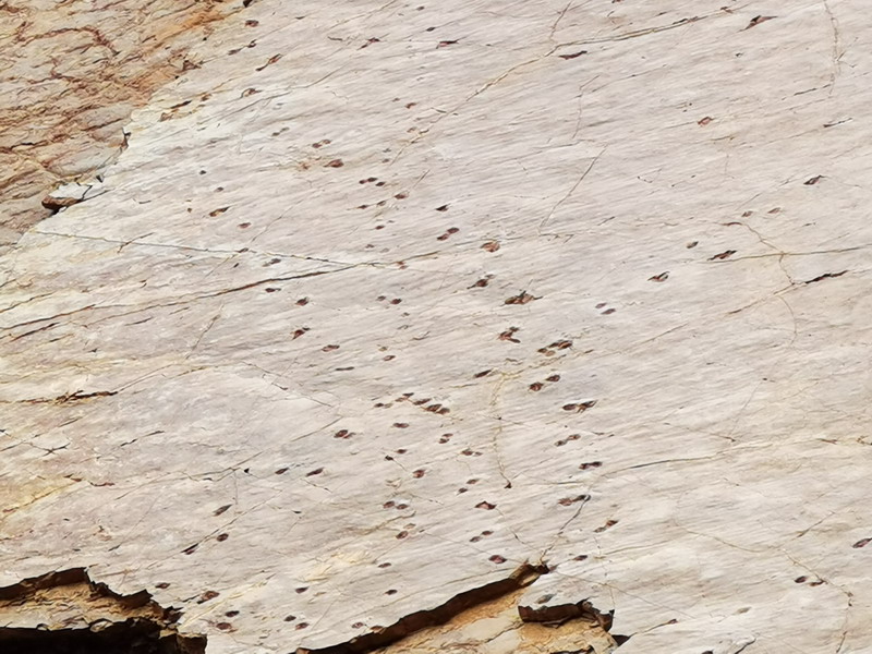 该产地出露面积达1500平方米,地层出露连续、沉积构造明显,足迹化石保存清晰、数量众多、类型丰富,在15个不同层位的产地剖面上规律分布着270余枚疑似蜥脚类、兽脚类恐龙等足迹化石,并同时赋存虫迹化石。