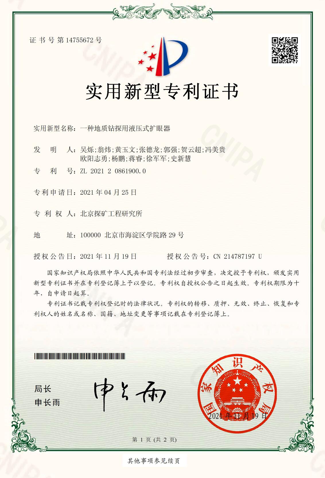 中国地质调查局北京探矿工程研究所研发的“一种地质钻探用液压式扩眼器”日前获国家实用新型专利授权(专利号ZL202120861900.0)。