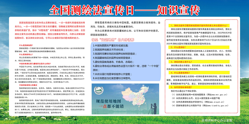 今年8月29日是第19个测绘法宣传日。为进一步加强测绘法宣传,提升广大干部职工的国家版图意识,倡导规范使用标准地图,中国地质调查局自然资源实物地质资料中心组织开展2022年测绘法宣传日暨国家版图意识宣传周活动。