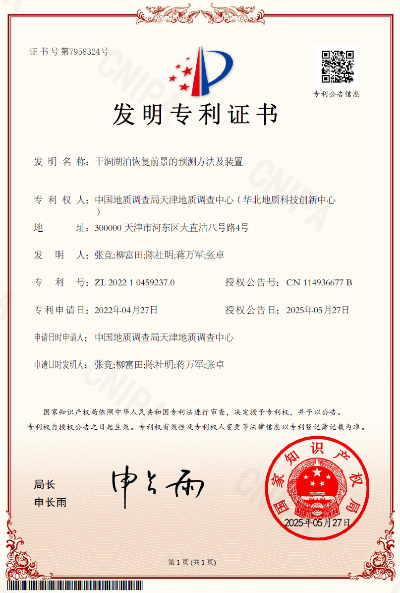 近日,由中国地质调查局天津地质调查中心研发的“干涸湖泊恢复前景的预测方法及装置”发明专利获国家知识产权局授权。