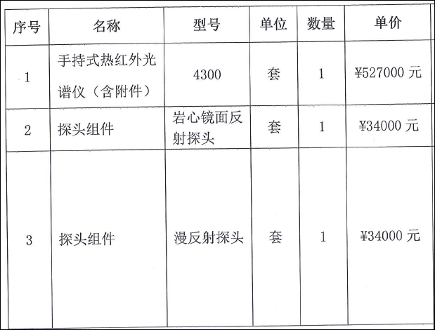 项目名称:中国地质调查局南京地质调查中心手持式热红外光谱仪采购项目 品牌:无 规格型号:详见附件 数量:详见附件 单价:详见附件 |