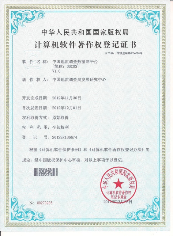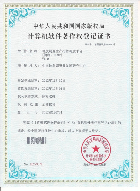 为充分展示大调查以来成果,扩大中央公益性地质调查工作影响,为找矿战略行动提供数据支持,及提升地质调查工作科学化管理、精细化管理和现代化管理的水平,在中国地质调查局主管部门的组织下,地质调查主流程信息化团队经过一年的努力,在前期数十年研究和技术积累的基础上,以基于跨平台中国地质调查信息网格GIS服务平台为依托,综合运用网格GIS、三维可视化、北斗卫星等技术,成功搭建了“中国地质调查数据网平台”和“地质调查生产指挥调度平台”。2012年12月,两个系统平台已分别获得计算机软件著作权。著作权人为中国地质调查局发展研究中心,授权单位为中华人民共和国国家版权局,证书号分别为:软著登字第0504710号、软著登字第0504780号。