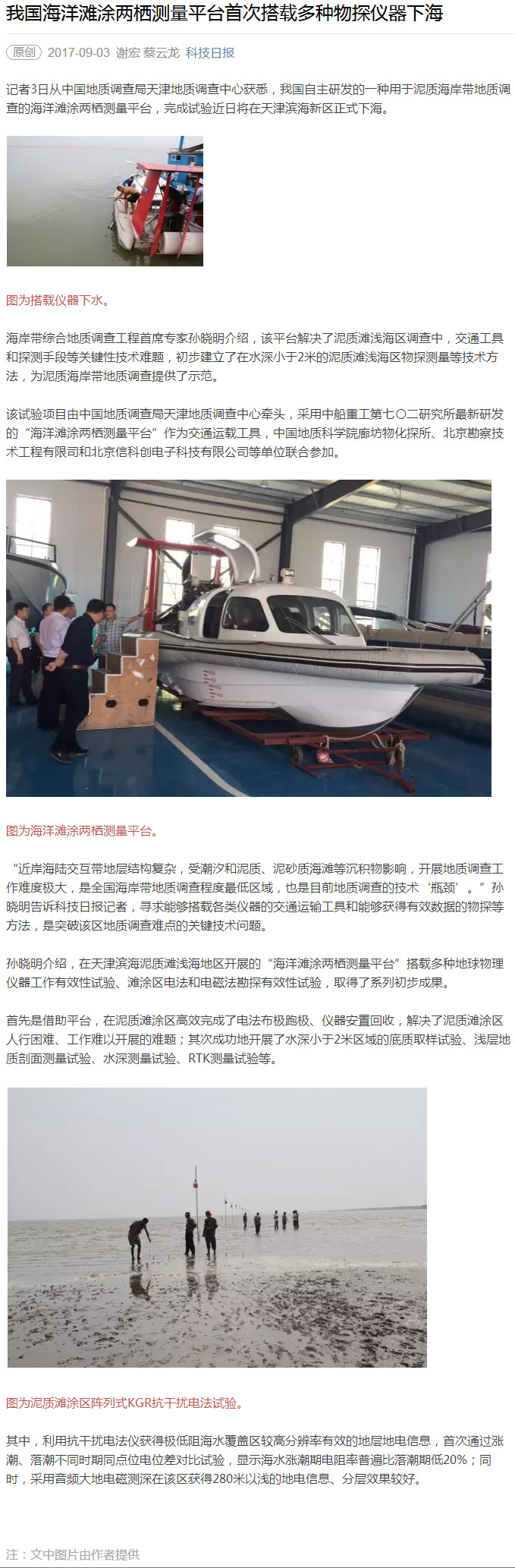 科技日报:我国海洋滩涂两栖测量平台首次搭载多种物探仪器下海