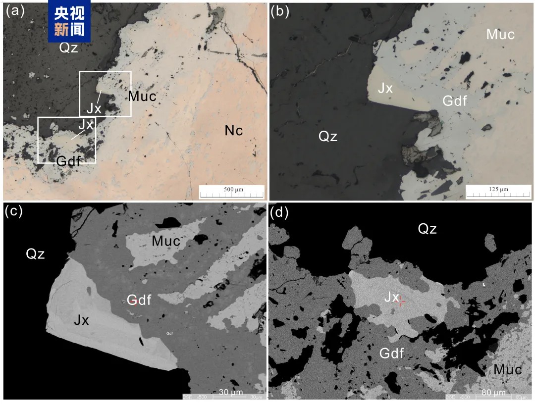 金秀矿(Jx)的反射光及背散射电子图像;Nc-红砷镍矿;Muc-砷镍矿;Gdf-辉砷镍矿;Qz-石英