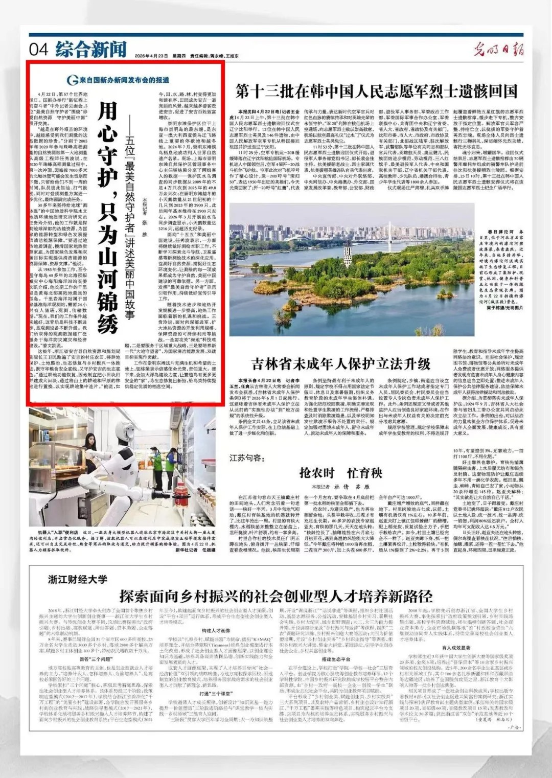 4月22日,第57个世界地球日。国新办举行“新征程上的奋斗者”中外记者见面会,5位“最美自然守护者”围绕“珍爱自然资源 守护美丽中国”展开交流。