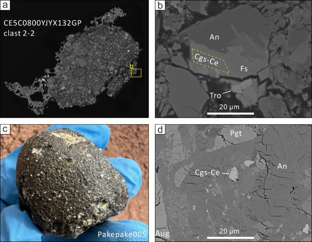 a: 嫦娥五号月壤,c: Pakepake005月球陨石, b,d: 铈嫦娥石及其共生矿物 (Cgs-Ce:铈嫦娥石,An: 钙长石,Fs: 铁辉石,Pgt: 易变辉石, Tro: 陨硫铁)