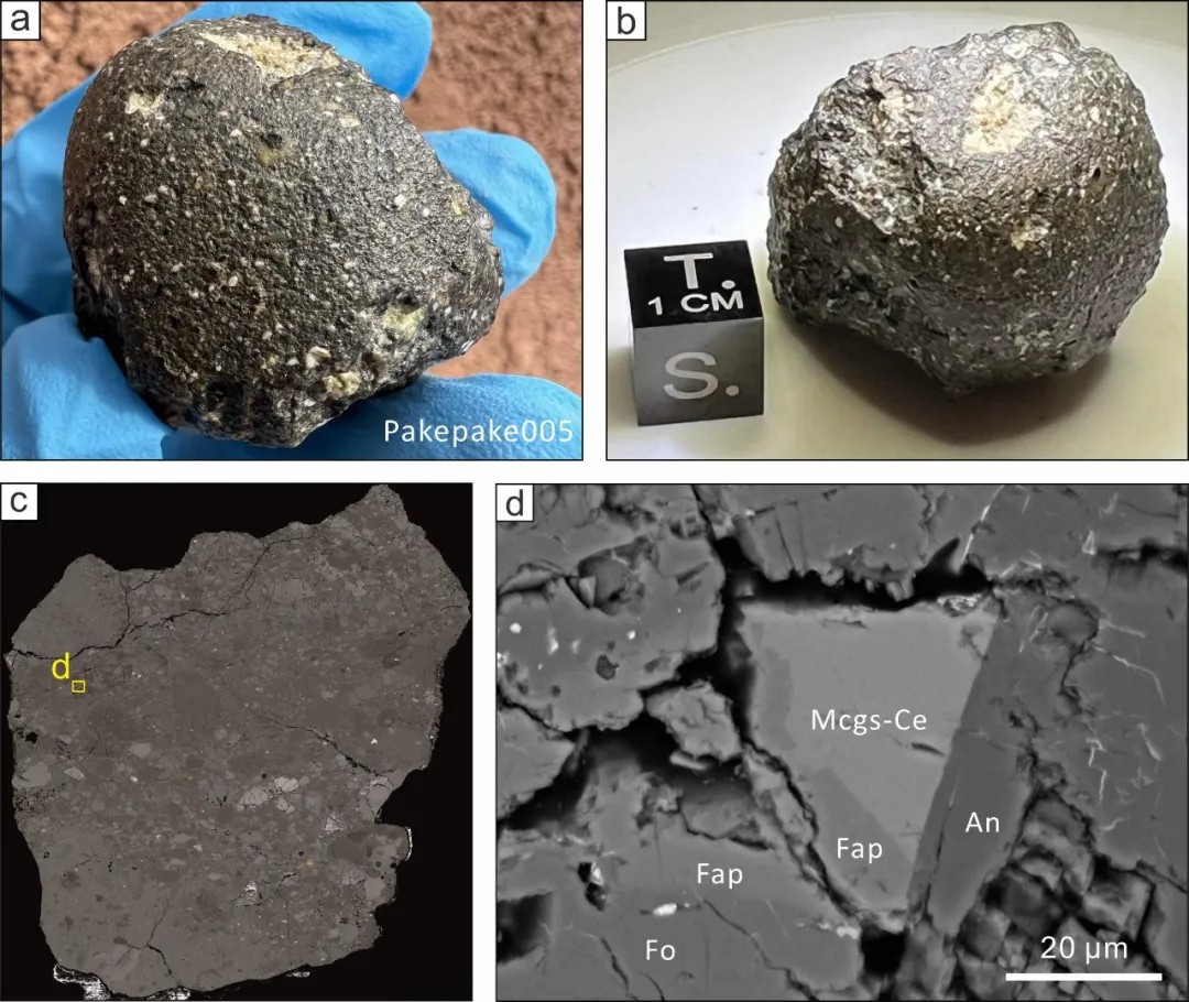 a-b:Pakepake005月球陨石,c:Pakepake005陨石切片电镜照片,d:铈镁嫦娥石及其共生矿物。