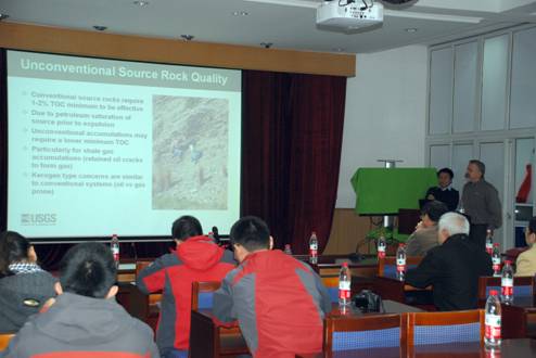 在学术报告中,Geoffrey S. Ellis针对目前页岩气、油页岩、页岩油等概念存在的误解进行了解读,对比分析了海相与湖相页岩气的差异,结合实例探讨了现代湖泊有机质沉积和保存作用,提出了湖相地层非常规油气空间分布模式,并对中方专家感兴趣的问题进行了详细解答。会后,美方专家与所领导及相关项目组成员针对将来的合作方向与领域深入交换了意见,为下一步友好合作研究奠定了基础。