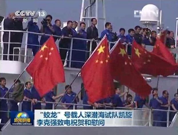 [央视]“蛟龙”号载人深潜海试队凯旋 李克强致电祝贺和慰问