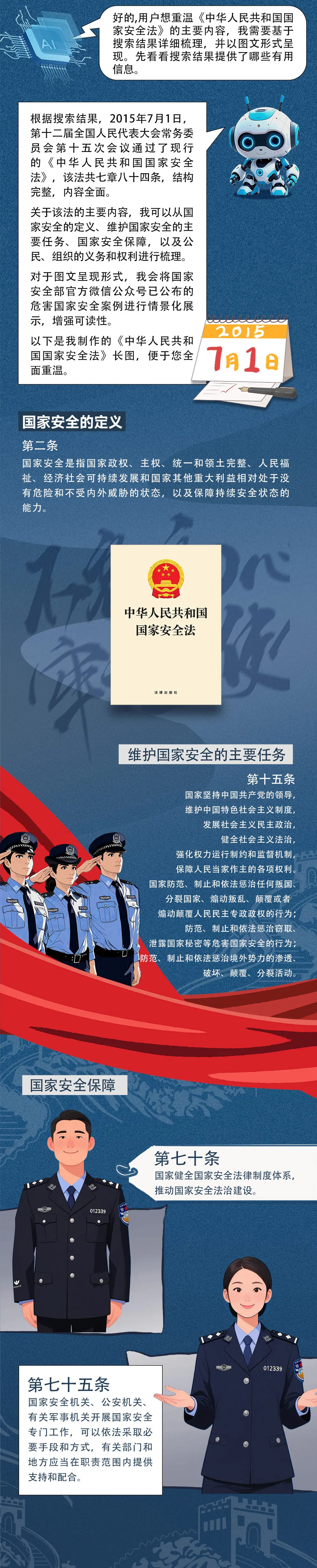 今年是《中华人民共和国国家安全法》颁布实施10周年。2015年7月1日,第十二届全国人民代表大会常务委员会第十五次会议审议通过新的《中华人民共和国国家安全法》。十年来,该法有力保障了总体国家安全观贯彻落实,有力促进了国家安全体系和能力现代化。下面,让我们一同回顾该法主要内容,共同增强国家安全意识,凝聚起全社会维护国家安全的强大合力。